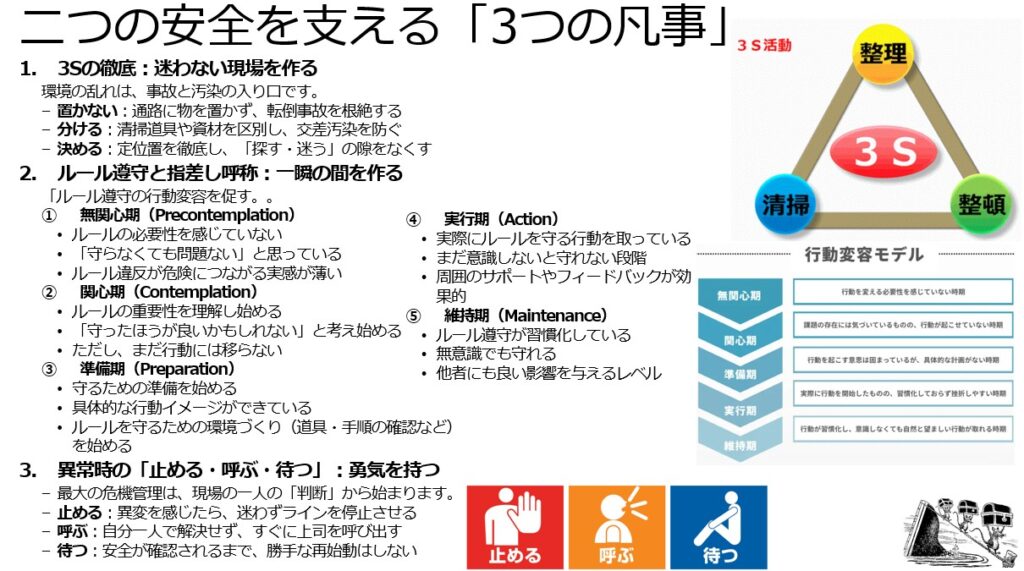 労働安全における「停止・確認」も、食品安全における「記録・検品」も、一度でも手を抜けば、それはもはやルールではなく「個人の裁量」になってしまいます。基本を疎かにすることは、プロフェッショナルとしての矜持を捨てることに他なりません。